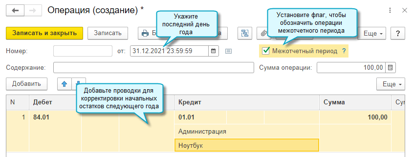 Операция, введенная вручную, проведенная 31 декабря с установленным флагом «Межотчетный период».