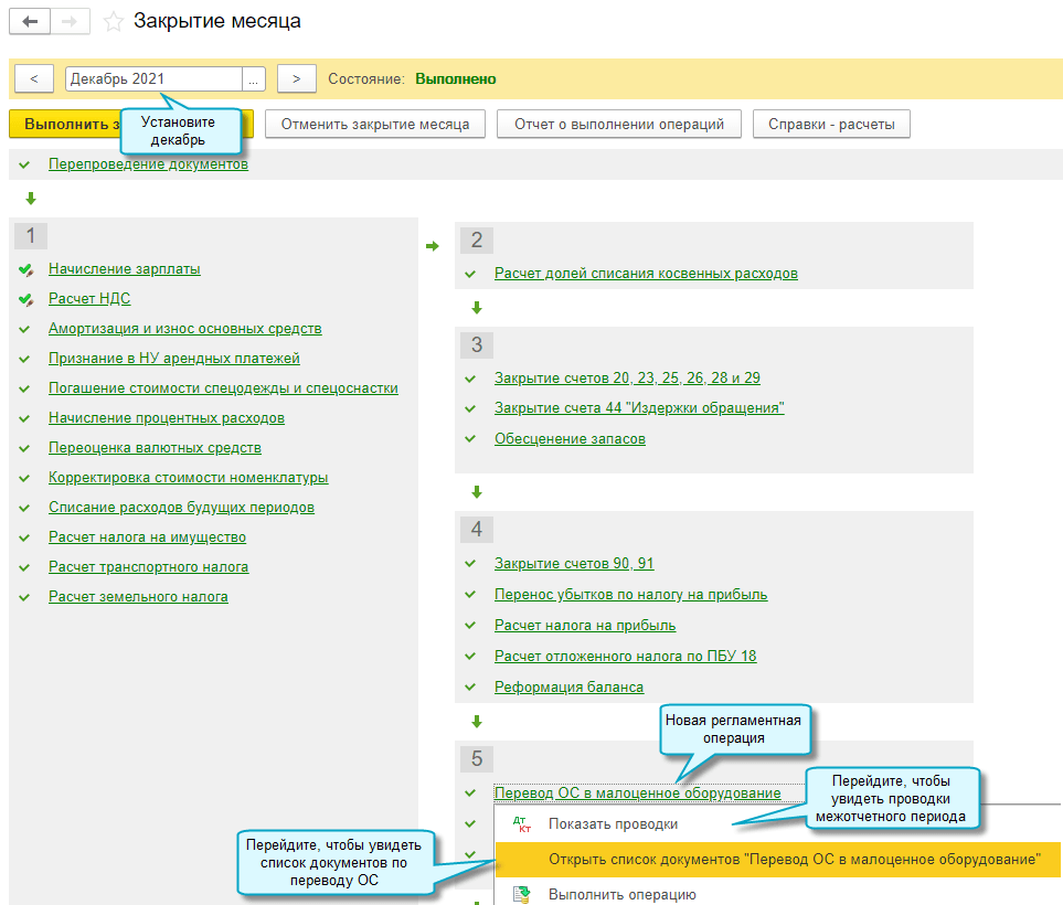 Добавлена регламентная операция перевода основных средств в малоценное оборудование для включения таких проводок в межотчетный период. Эта регламентная операция добавлена в пятую группу закрытия месяца декабря.