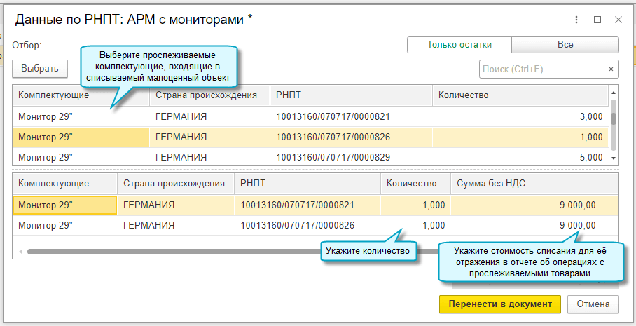 При списании комплектов с прослеживаемыми материалами РНПТ указывается вручную в документе списания.