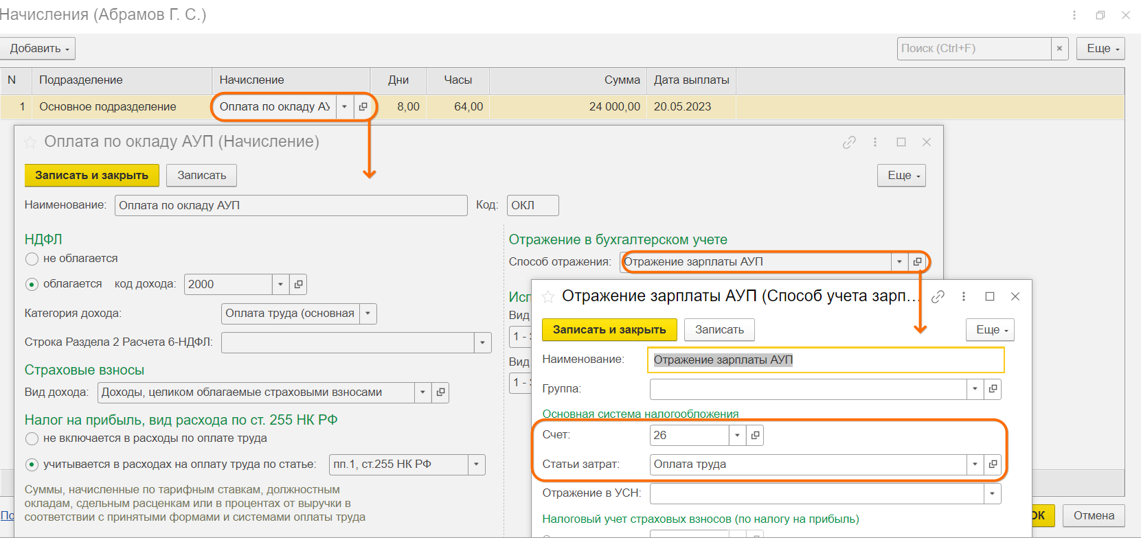 Можно провалиться в расшифровку суммы Начислено и убедиться, что нашему начислению Оплата по окладу сопоставлены счет и статья затрат (иначе документ не сформирует проводки по начислению).