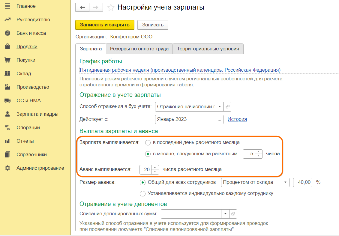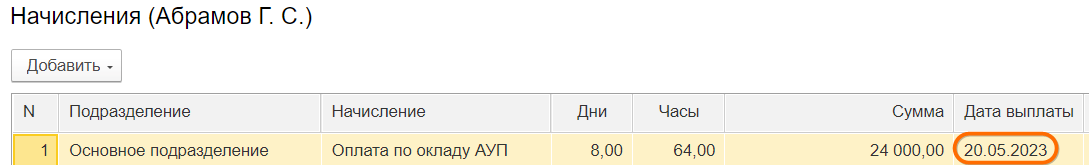 в самом краю есть очень важная дата – дата предполагаемой выплаты. Программой она берется: для зарплаты – из Зарплата и кадры – Настройки зарплаты – Порядок расчета зарплаты, для межрасчетных начислений – из документов собственно этих начислений