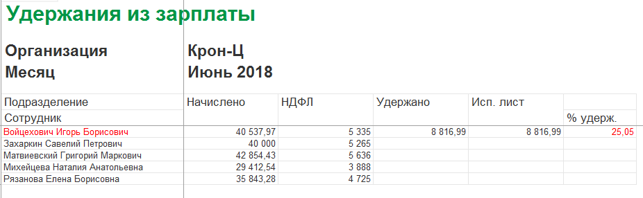 Для анализа таких удержаний предусмотрен отчет «Удержания из зарплаты», который находится в меню «Зарплата – Отчеты по зарплате». Красным цветом выделяются сотрудники, у которых размер удержаний превышает 20%.
