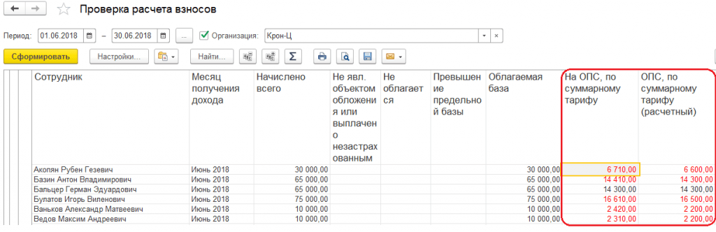 Для проверки исчисленных взносов в ПФР, ФСС, ФОМС в системе ЗУП с расчетными данными необходимо использовать отчет «Проверка расчета взносов», расположенный в меню «Налоги и взносы – Отчеты по налогам и взносам». Отчет показывает взносы, полученные расчетным путем. Если расчетные данные отличаются от указанных в системе, такие строчки отображаются красным.