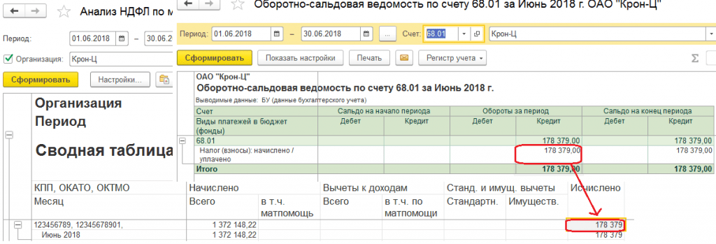 Для анализа налогооблагаемой базы, примененных вычетов и сопоставления исчисленного, удержанного и перечисленного НДФЛ необходимо использовать отчет «Анализ НДФЛ по месяцам». Исчисленный НДФЛ должен совпадать с НДФЛ по счету 68 в оборотно-сальдовой ведомости в 1С:Бухгалтерия.