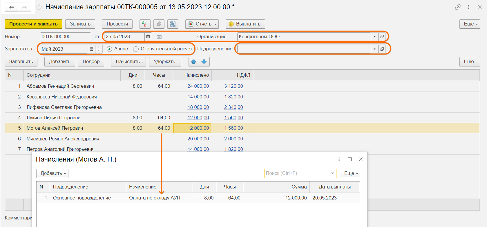 В документе будут отображаться фамилии сотрудников, наименование подразделения, вид начисления, размер заработной платы, количество отработанных дней и часов.