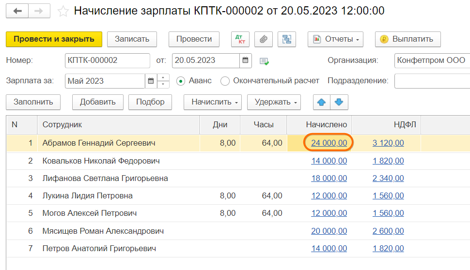 16. Осталось только нажать кнопку «Провести и закрыть». Готово! Зарплата начислена.