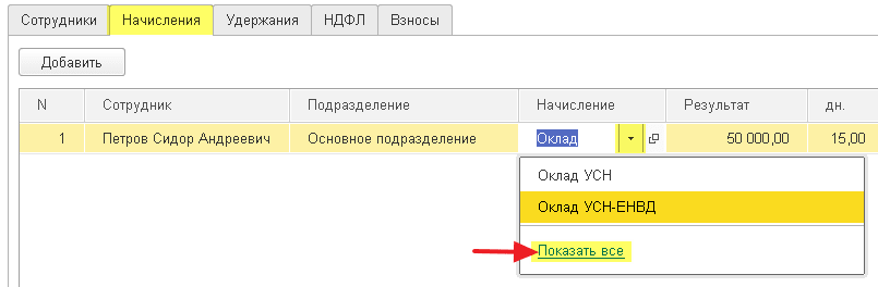 4. Список заполнился сотрудниками, перейдите на закладку «Начисления». Здесь выберите нужный вид начисления. По умолчанию расходы по заработной плате в 1С:Бухгалтерия 8.3 относятся на 26 счет. Если вам именно это и нужно — ничего не меняйте. Но если требуется отнести расходы по заработной плате на другой счет — нужно создать новое начисление (стрелка вниз, показать все).