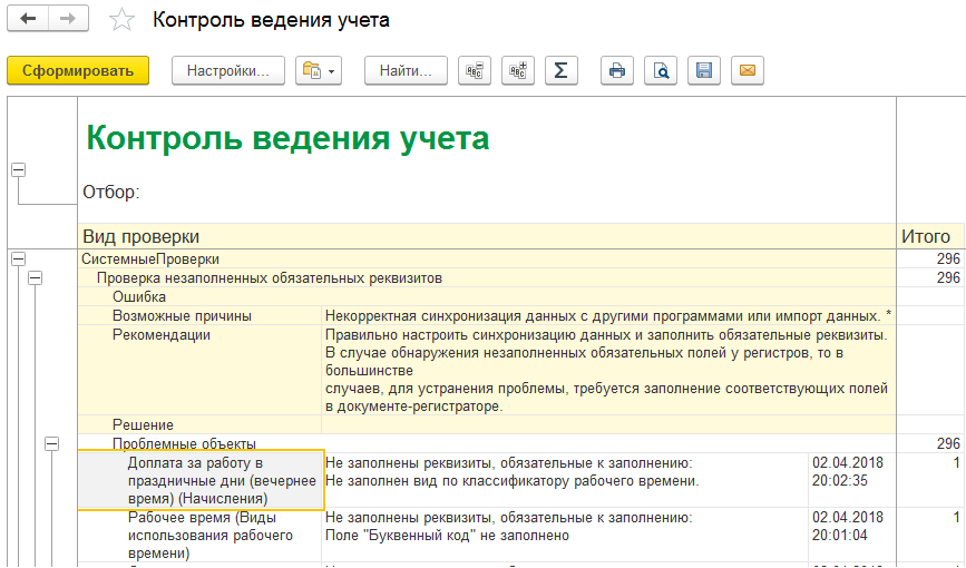 Отчет расположен в справочнике «Отчеты» и предназначен для просмотра и устранения выявленных проблем с документами, регистрами и любыми данными в программе, для просмотра результатов проверок ведения учета. В отчете выводится вид проверки – сведения о проверке и перечень проблемных объектов, возможные причины и рекомендации по исправлению.