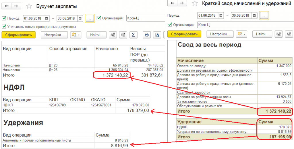 Отчет показывает данные в документах «Отражение зарплаты в бухгалтерском учете» за указанный период. Суммы по блокам «Начислено», «НДФЛ», «Удержано» должны совпадать с данными по расчетным регистрам.