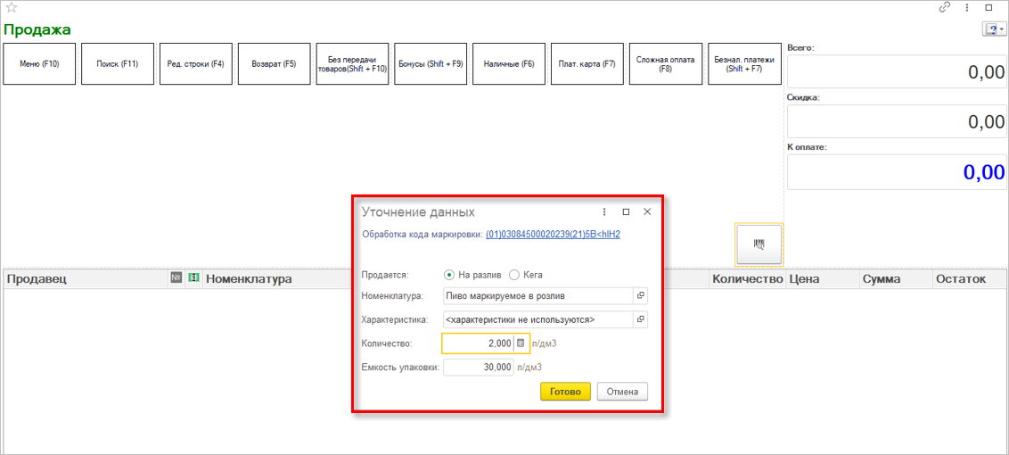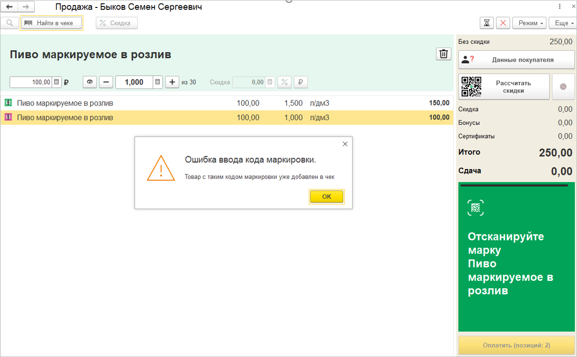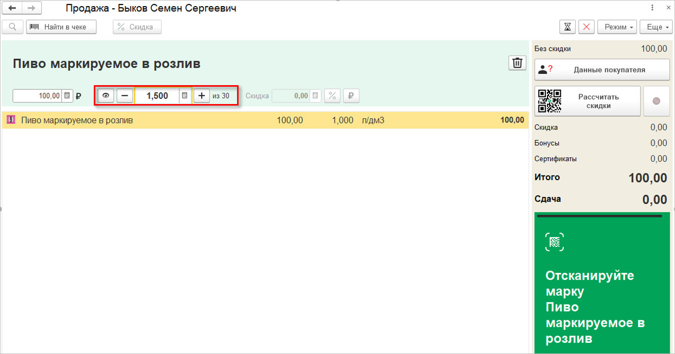 Работа с маркировкой разливного пива в режиме магазина. Сканировать марку нужно при продаже каждой позиции.