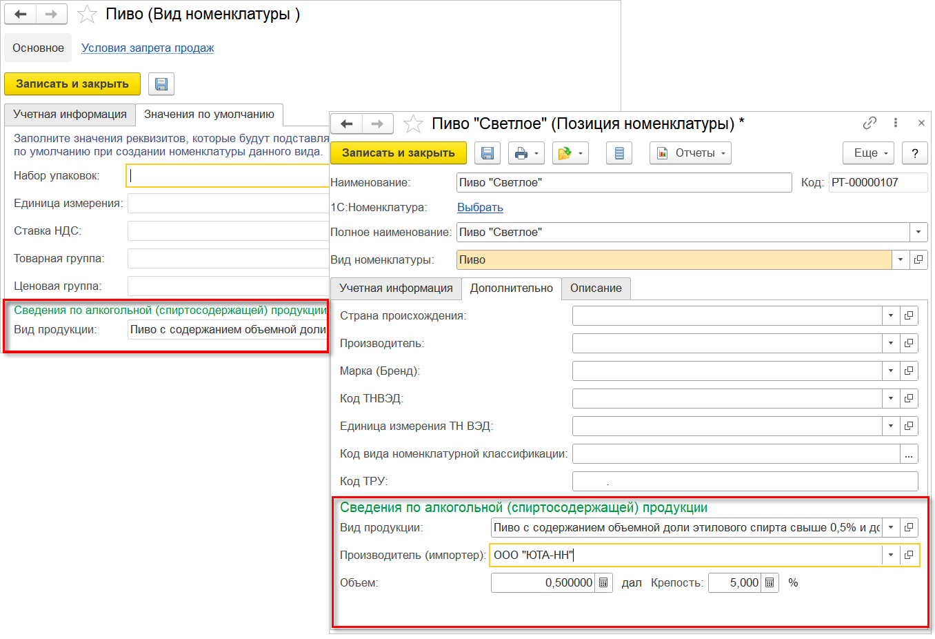 Ведение учета в 1С предполагает внесение сведений в справочник номенклатуры. После того, как будут настроены необходимые параметры, в карточке станет доступен раздел «Алкоголь», с которыми нам предстоит работать. В представленной карточке следует заполнить информацию о производителе (импортере при необходимости).