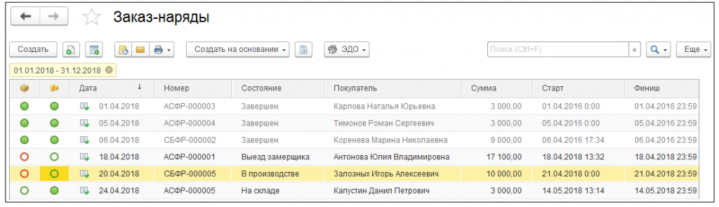 Раздел предназначен для планирования и контроля работ по заказ-нарядам и заданиям на работы. Здесь же отображается учет рабочего времени и графики работы каждого сотрудника. Можно увидеть, на какой стадии выполнения та или иная работа.