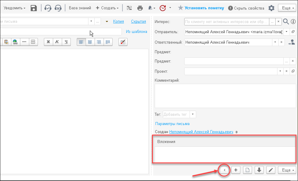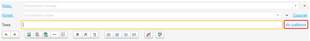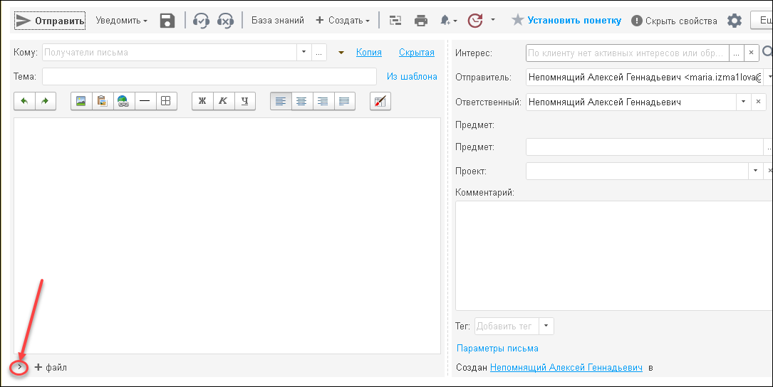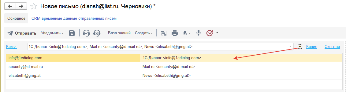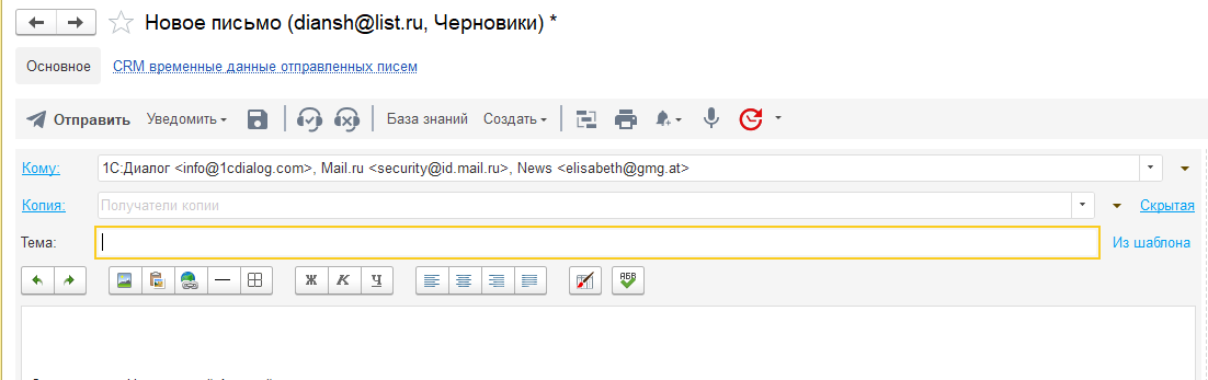 В полях «Кому» и «Копия» пользователь указывает начало имени или адреса электронной почты адресата. Программа сама попытается найти получателя среди потенциальных клиентов, клиентов, контактных лиц или пользователей программы. При помощи кнопки «Скрыть/показать получателей письма» можно просмотреть список получателей письма.