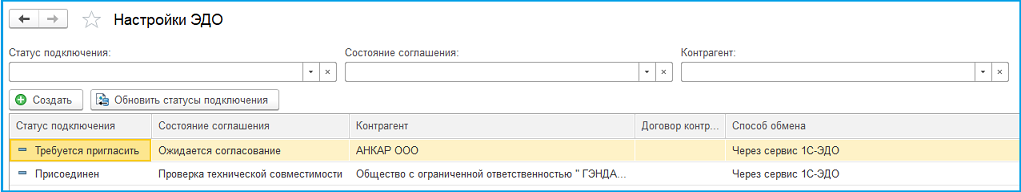 В «Настройках ЭДО» отображаются отправленные созданные настройки со статусами подключения, что помогает отследить подключенных контрагентов и тех, кто только подключил себе сервис.