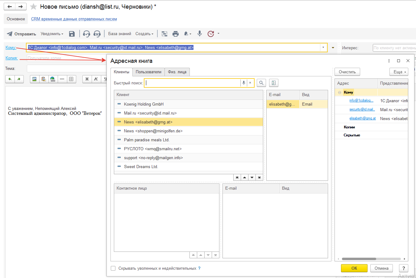 После выполнения команды ОК информация о выбранных получателях будет перенесена в список получателей электронного письма.