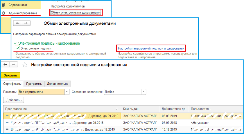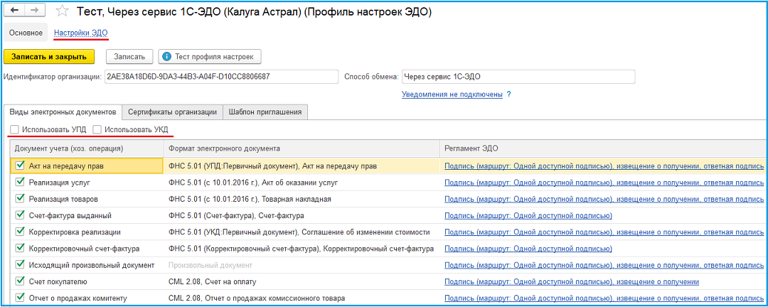 После создания профиля настроек его необходимо записать, затем провести «Тест профиля настроек», указав при проверке пароль от сертификата электронной подписи. Здесь же, в «Профиле настроек», можно указать возможность использования УПД и УКД. После проведения описанных выше действий можно приступать к «Настройке ЭДО».