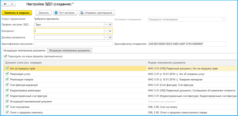 В открывшемся окне нужно выбрать контрагента, записать настройку, выполнить «Тест настроек» и затем отправить приглашение выбранному контрагенту. В приглашении контрагентам, использующим «1С-ЭДО» или работающим с другими операторами ЭДО СФ (см. ниже), автоматически проставляется идентификатор участника ЭДО, для пользователей других операторов ЭДО необходимо указать электронную почту. После заполнения полей формы можно отправить приглашение и записать настройку.