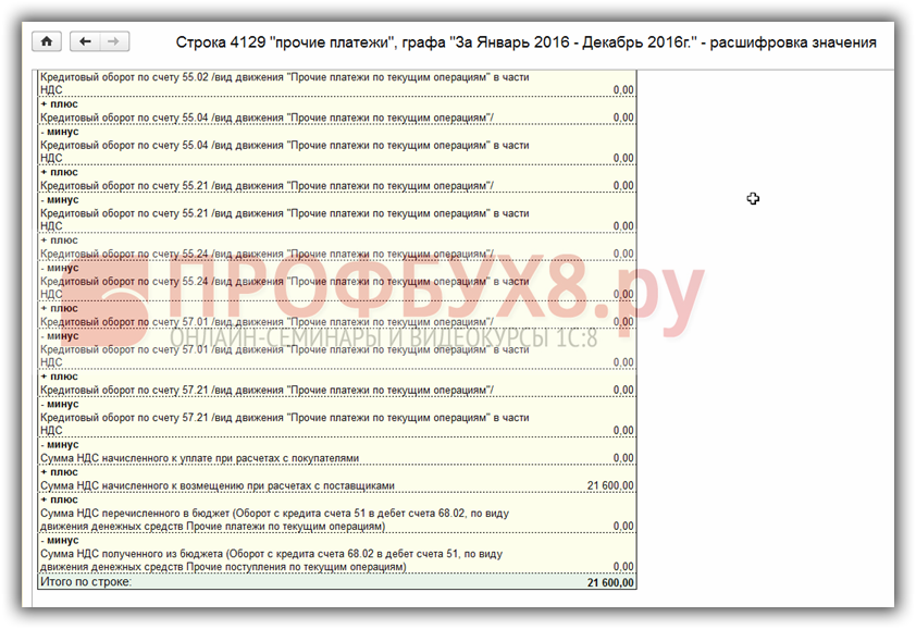 Видим, что общая сумма оплаты поставщикам отражена в отчете правильно. Причем отдельно выделен НДС, начисленный к возмещению при расчетах с поставщиками, что можно выяснить, выбрав расшифровку строки: