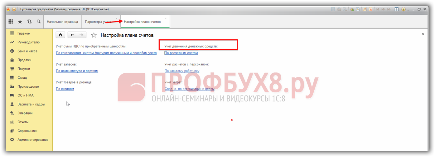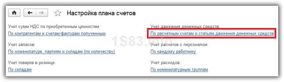 В открывшейся форме нажмите на ссылку «Настройка плана счетов». Дальше выберите пункт «По расчетным счетам». В этом примере пункт называется «По расчетным счетам и статьям движения денежных средств» в связи с тем, что все настройки были установлены по умолчанию ранее.