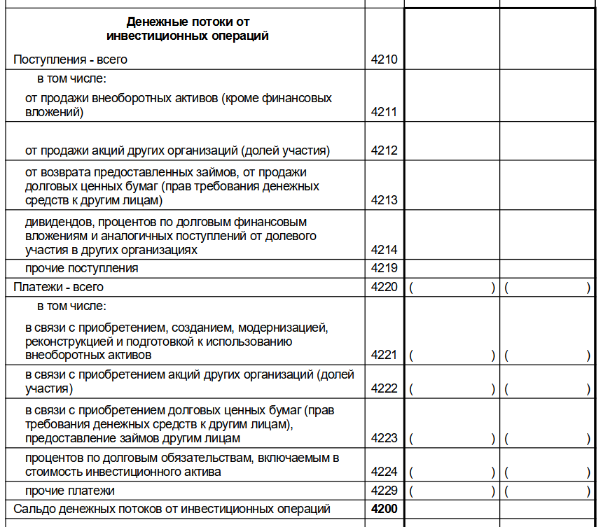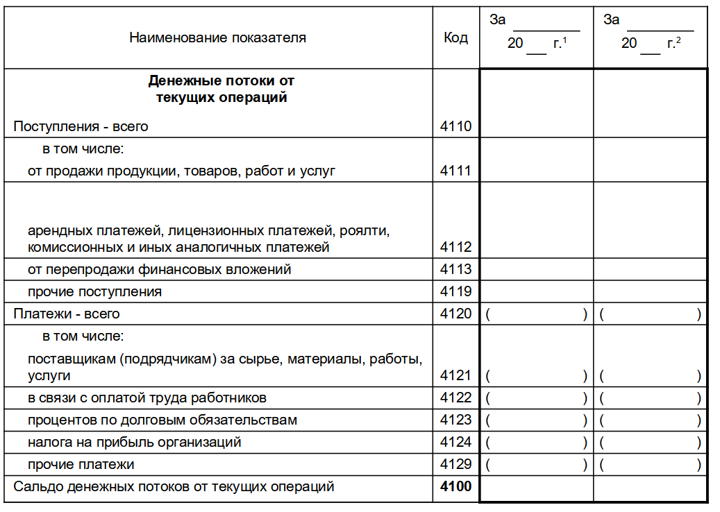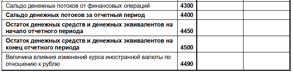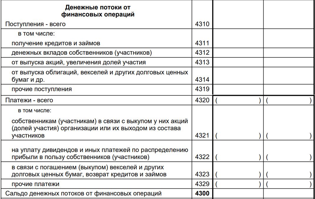 В круглых скобках отражаются платежи, то есть суммы, которые уменьшают остаток. В конце каждого раздела считается сальдо денежных потоков по конкретной группе операций.