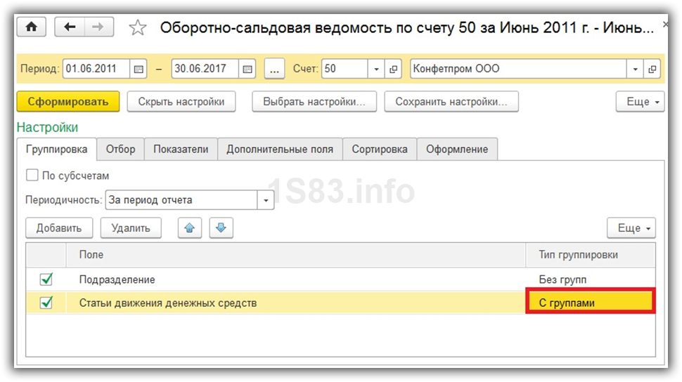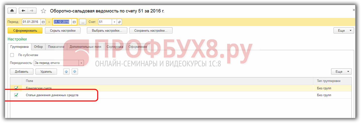 Чтобы в 1С 8.3 получить ОСВ в подобном виде, следует в настройках выбрать Группировку по статьям движения денежных средств: