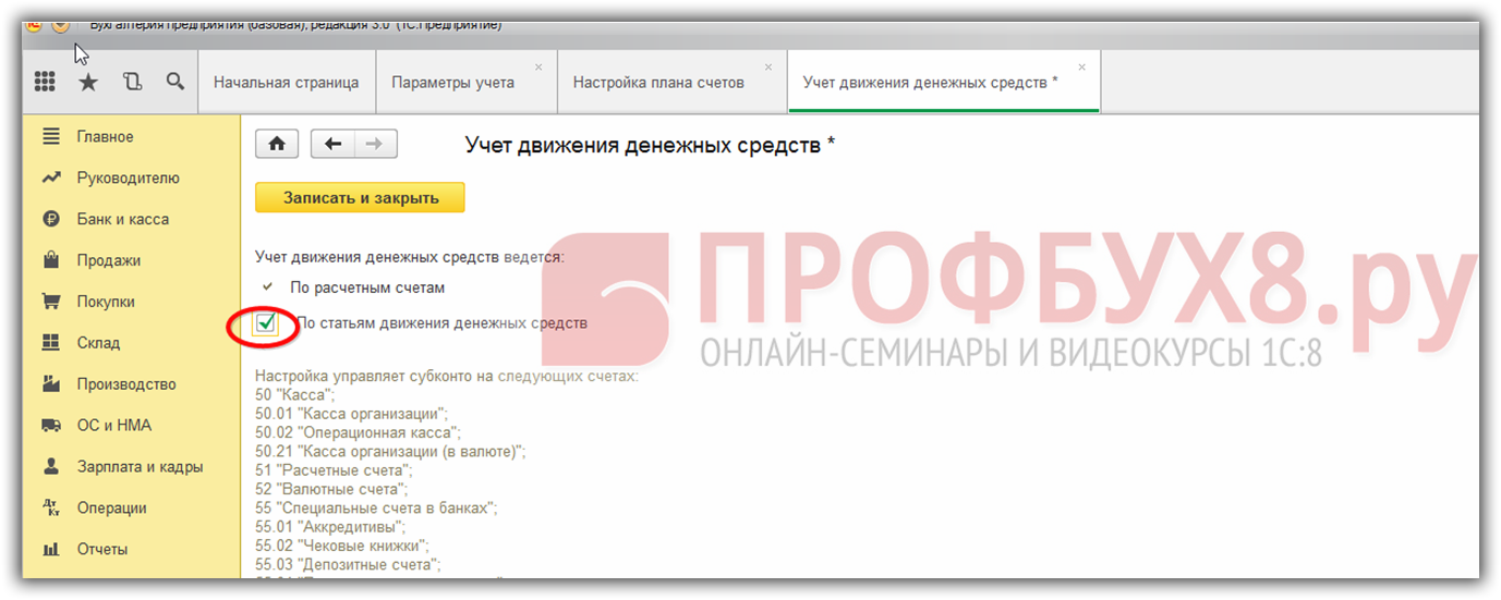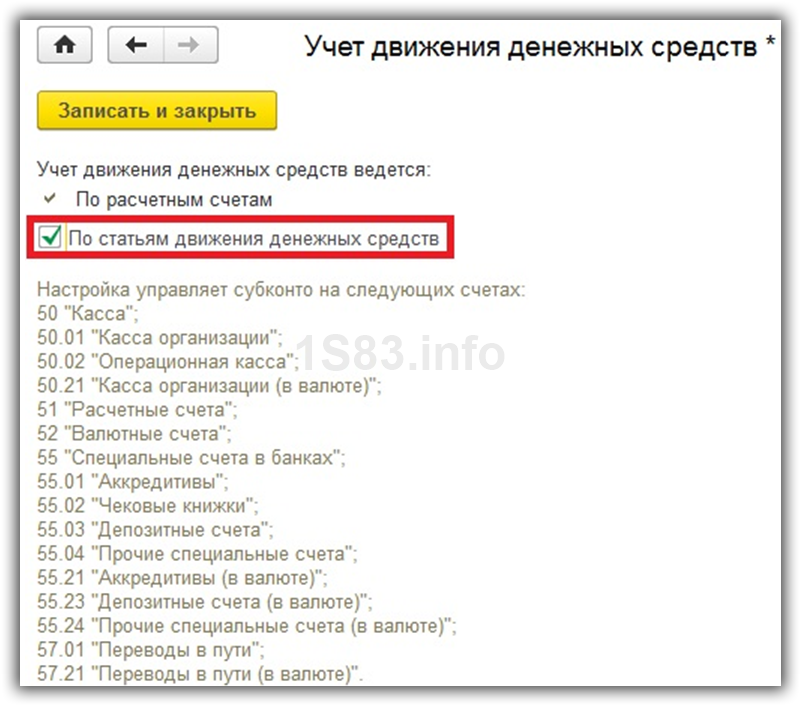 Ставим галочку в поле По статьям движения денежных средств и нажимаем Записать и закрыть: