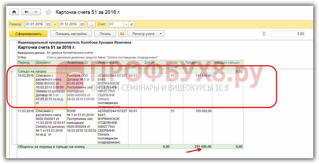 Посмотрим, как в 1С 8.3 отразилась данная операция в оборотно-сальдовой ведомости счета 51, а также в карточке этого счета. В нашем случае карточка по счету 51 выглядят следующим образом: