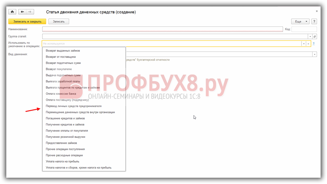 В поле Использовать по умолчанию в операциях, можно выбрать из выпадающего меню операцию, при отражении которой статья денежных средств будет подставляться автоматически: