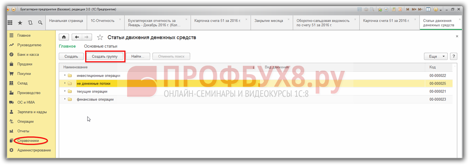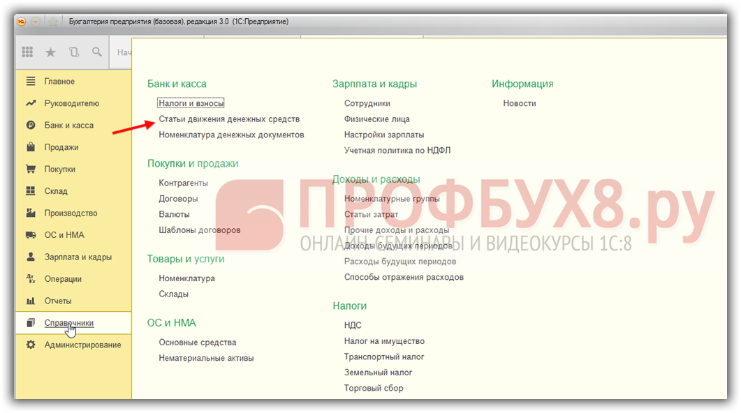 В разделе Справочники на панели навигации теперь отображается справочник Статьи движения денежных средств: