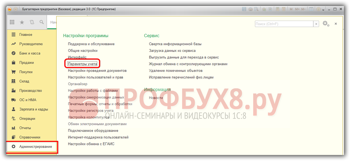 Для того, чтобы настроить использование статей движения денежных средств в 1С 8.3 перейдите в меню «Администрирование» и выберите пункт «Параметры учета».