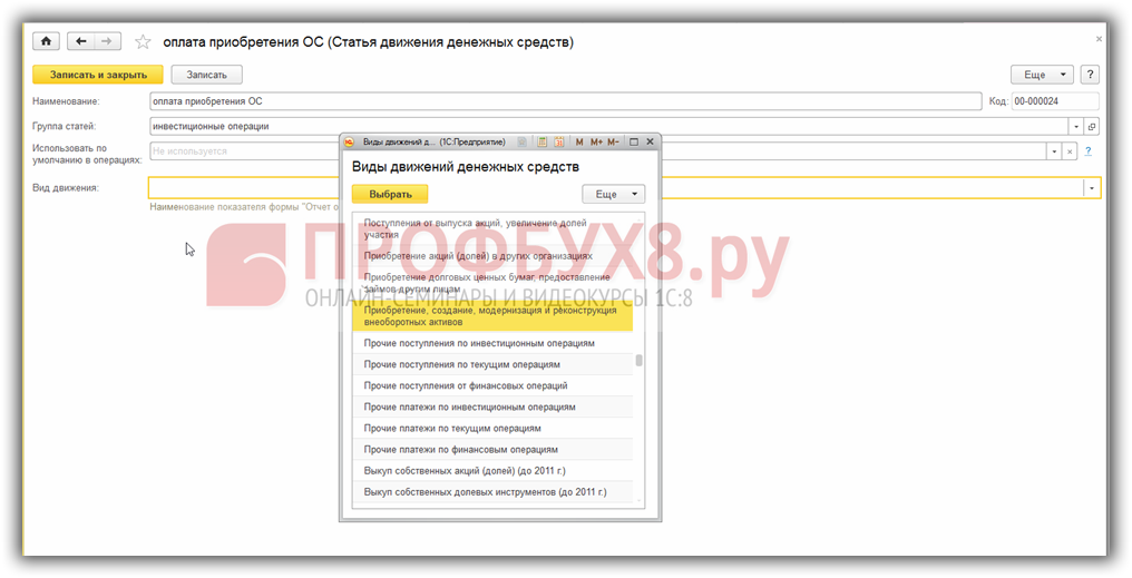 Обратите внимание, что под строчкой Вид движения подсказка Наименование показателя формы Отчет о движении денежных средств бухгалтерской отчетности. Открываем выпадающего список и выбираем нужную статью: