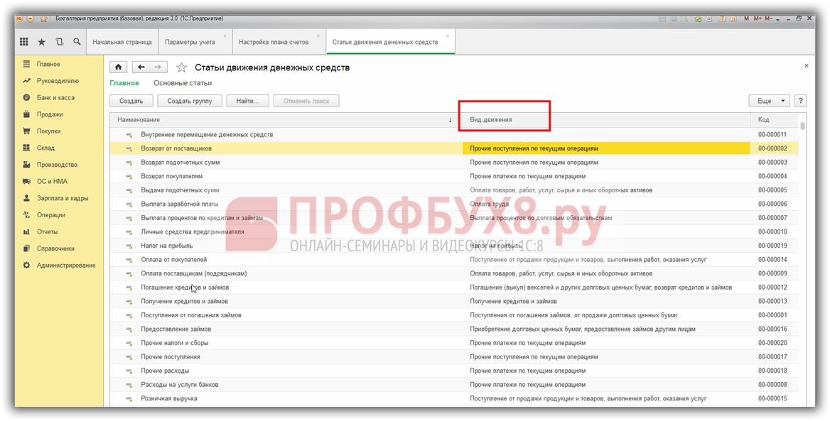 Теперь самое главное. Чтобы отчет по форме ОКУД 0710004 формировался в 1С 8.3 без ошибок, нужно правильно выбирать вид движения денежных средств, потому что именно этот реквизит настроен в соответствии с данным отчетом. Виды движения денежных средств предопределены в 1С 8.3, в то время как наименование статей денежных средств организация может определять самостоятельно: