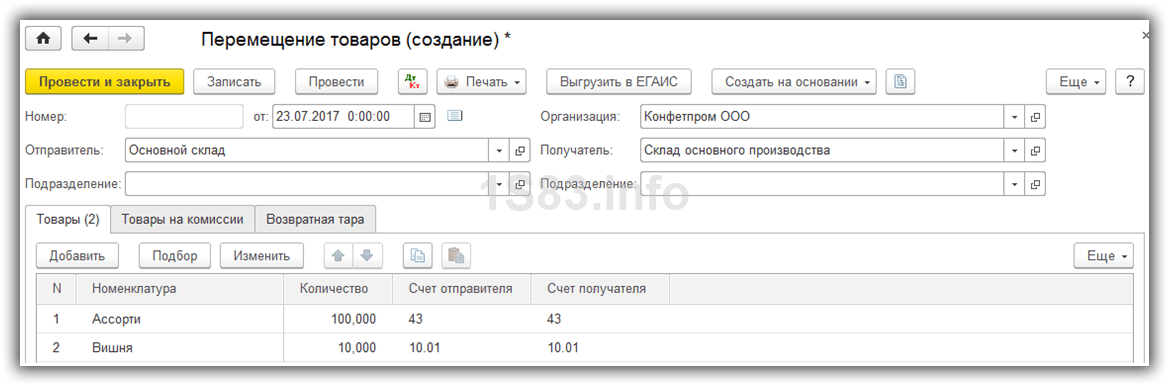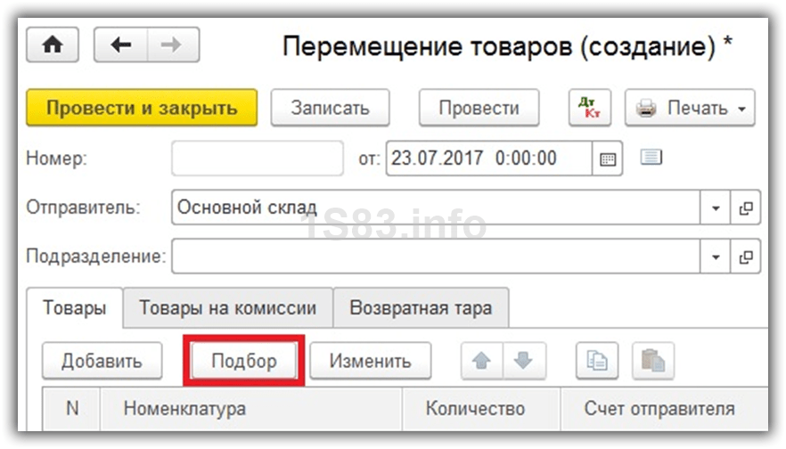 Ниже, на вкладке «Товары» перечислите все перемещаемые ТМЦ и их количество. Мы воспользуемся кнопкой «Подбор», хотя добавить здесь товары можно и вручную.