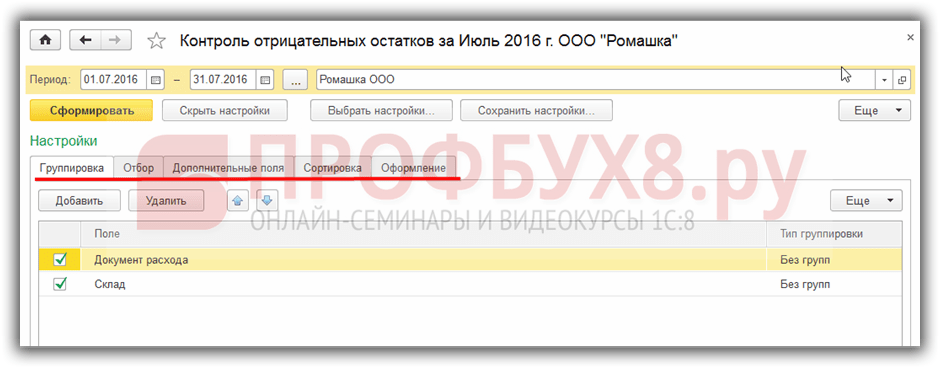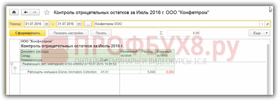 Важно! Отчёт Контроль отрицательных остатков показывает отрицательные остатки только за указанный период. Если были документы списания ранее начала отчёта, то отрицательные остатки по ним не попадут в отчёт