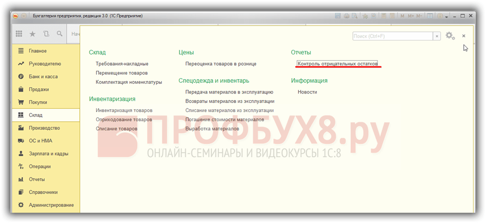 Отчёт Контроль отрицательных остатков в 1С 8.3 находится в разделе Склады – далее Контроль отрицательных остатков: