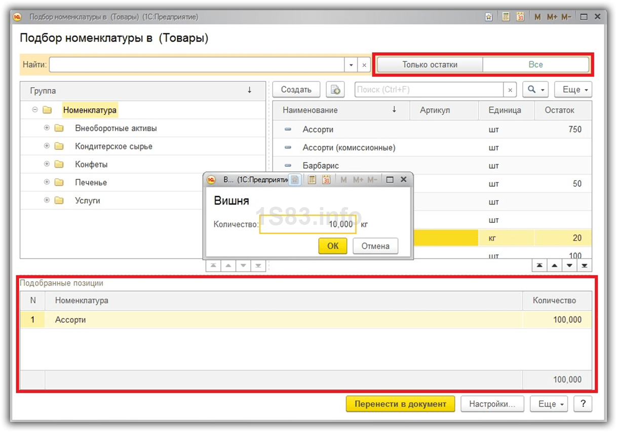 Все позиции с их количеством, которые вы выбрали, отображаются в нижней табличной части. После того, как вы закончите с выбором, нажмите на кнопку «Перенести в документ».