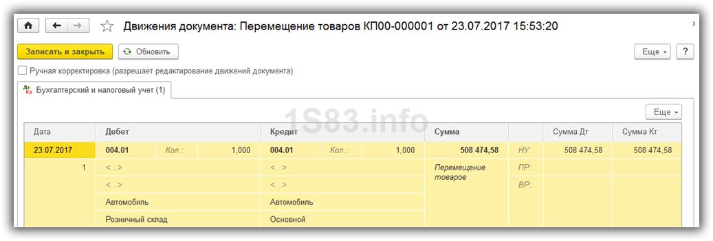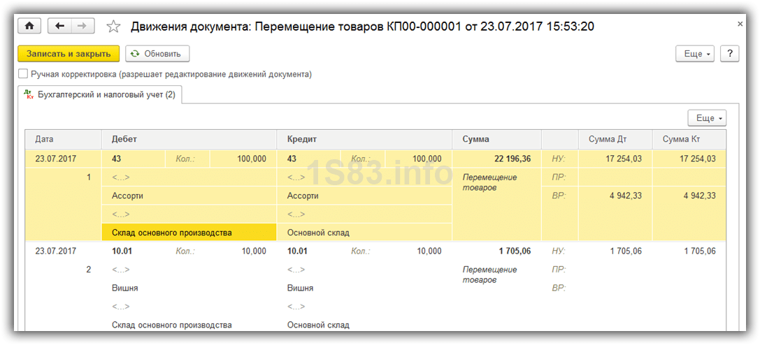 Табличная часть заполнилась и счета проставлены автоматически. Менять мы их не будем. Осталось только провести документ и посмотреть, какие движения он произвел.