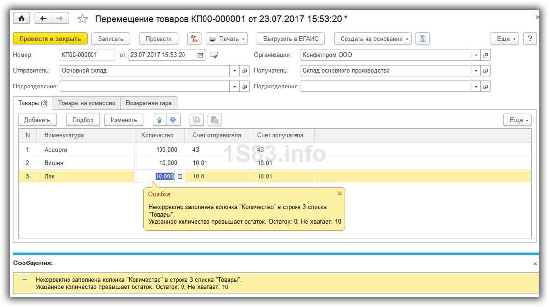 При добавлении товаров мы воспользовались кнопкой подбора потому, что очень сложно хранить в голове точные остатки товаров на складах. Если вручную указать в табличной части количество, превышающее остаток, то попытке провести такой документ, программа выдаст ошибку. Провести его, конечно же, вам не удастся.