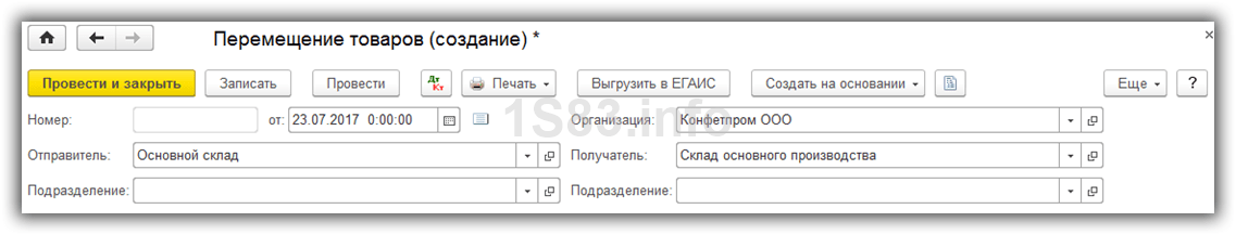 В принципе, заполнить документ перемещения очень просто. В шапке укажите склады отправителя и получателя. Так же есть возможность перемещать товары между подразделениями.