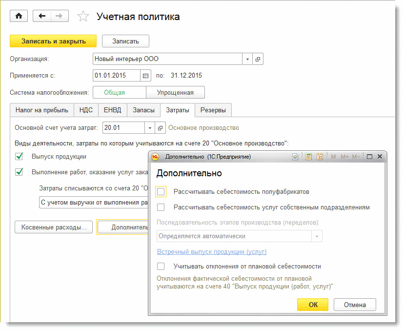 Для целей бухгалтерского учета порядок распределения косвенных затрат по наименованиями продукции настраивается в форме Учетная политика (раздел Главное — Учетная политика — Косвенные затраты).