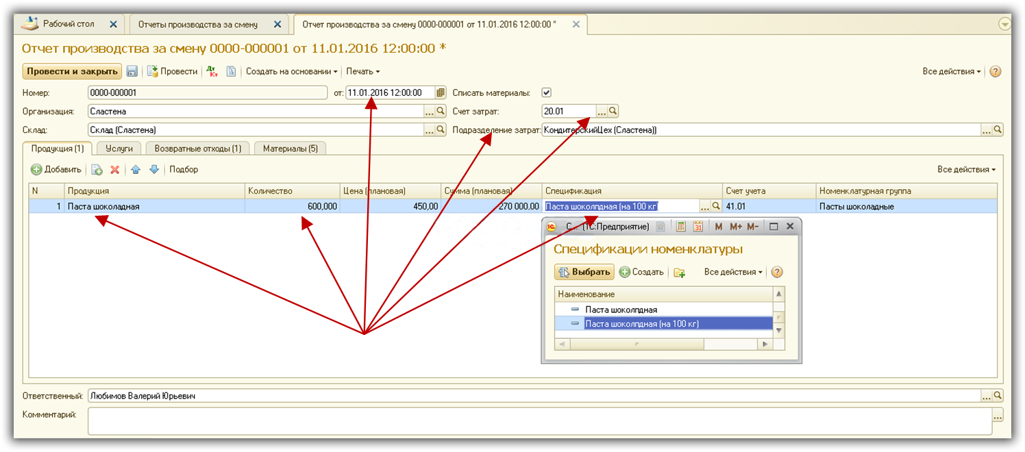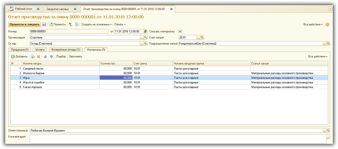 Далее определите, какого рода потери, и до процедуры Закрытия месяца отразите их в Операции, введенной вручную . Если потери на брак: