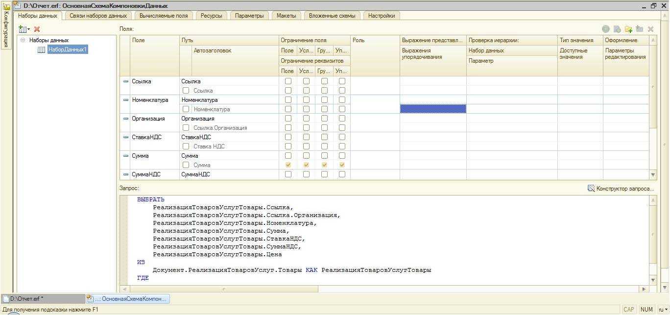 Все параметры указанные в запросе отобразятся на закладке Параметры схемы компоновки. В нашем случае это НачалоПериода, КонецПериода и Организация. Пройдемся по некоторым их настройкам: