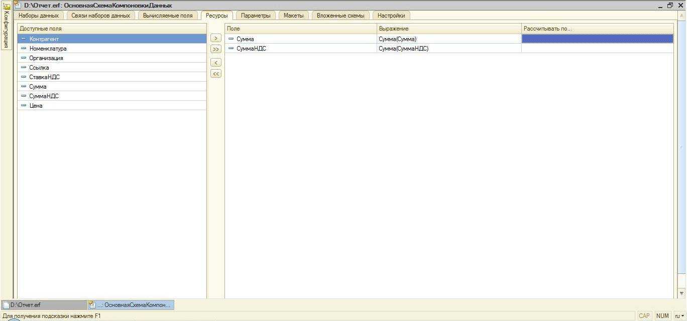 Под полями-ресурсами в системе компоновки данных подразумеваются поля, значения которых рассчитываются на основании детальных записей, входящих в группировку. По сути ресурсы являются групповыми или общими итогами отчета. В нашем случае ресурсами будут поля Сумма и СуммаНДС. Итоги по ресурсам можно рассчитывать при помощи функций языка выражений СКД, самые простые из них это Сумма(), Среднее(), Максимум(), Минимум() и Количество(). Что бы задать ресурсы отчета надо перейти на закладку Ресурсы и перетащить необходимые поля отчета в таблицу ресурсов. После этого необходимо задать выражение(в нашем случае Сумма()), также вы можете выбрать группировки для которых хотите видеть итоги по по данному ресурсу, это можно сделать в столбце Рассчитывать по….