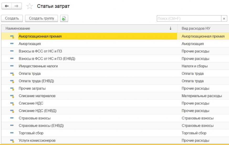 В последних базах данных справочник по умолчанию заполняется значениями наиболее распространенными разновидностями затрат, а именно: