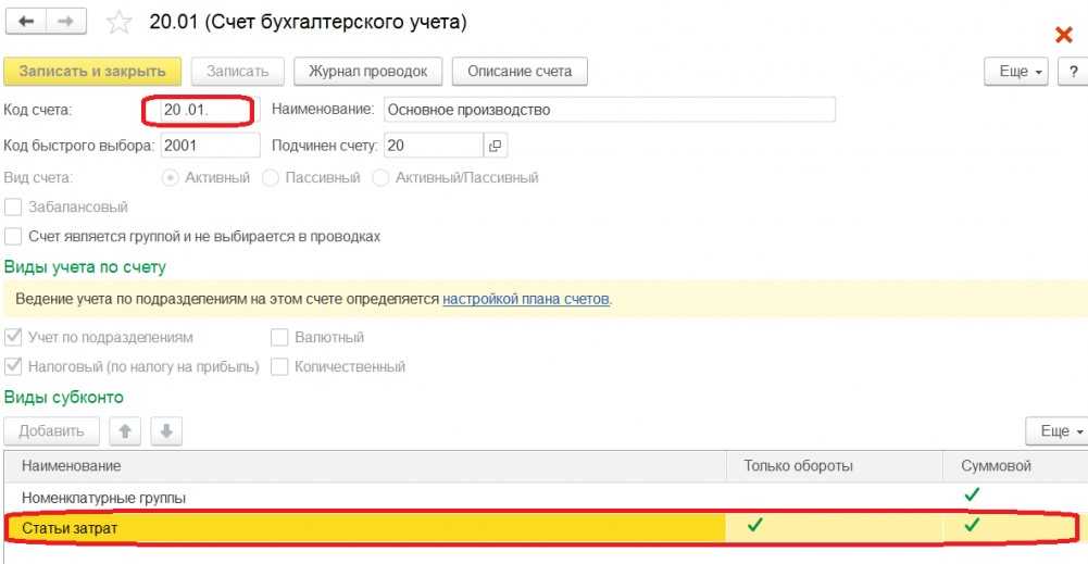 В рассматриваемом программном обеспечении аналитика к счету имеет следующий вид (как пример, касательно счета 20.01):