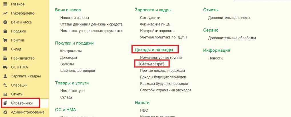 Для открытия справочника нужно зайти в меню: Справочники – затем в Доходы и расходы – потом выбрать ссылку статьи затрат, где появится окно справочника.
