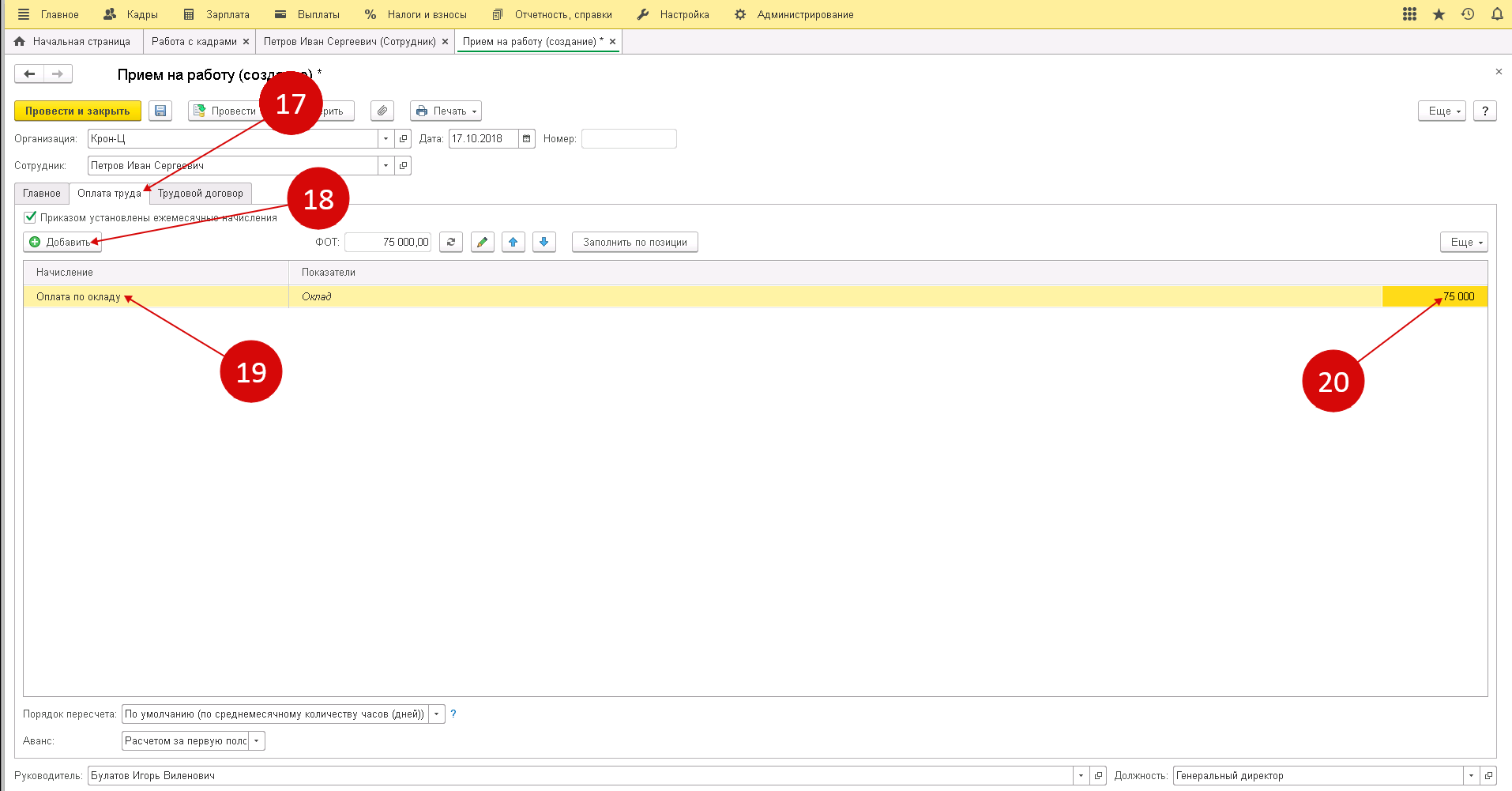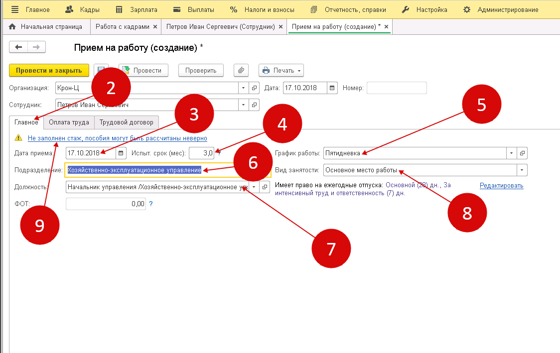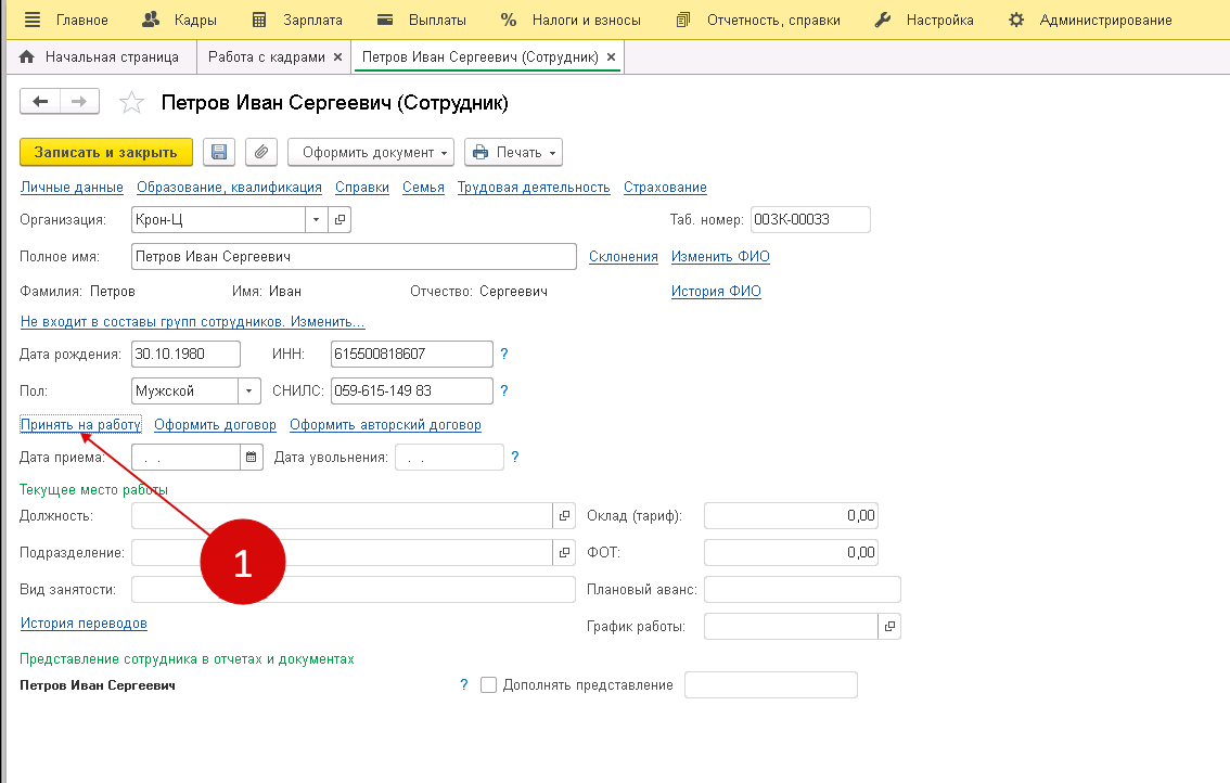 Шаг 3. Оформите прием на работу нового сотрудника в 1С 8.3 ЗУП