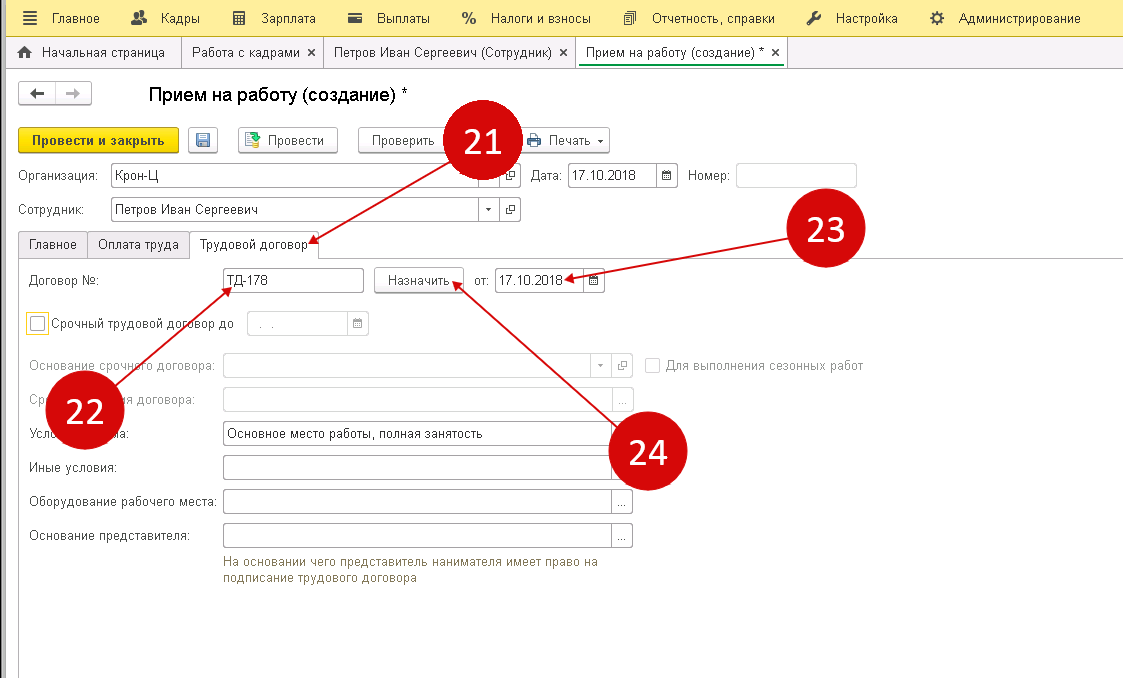 Далее кликните на вкладку «Трудовой договор» (21). Здесь укажите его номер (22) и дату подписания (23). Если нумерацию трудовых договоров вы ведете в 1С 8.3 ЗУП, то нажмите кнопку «Назначить» (24) для автоматического определения номера.