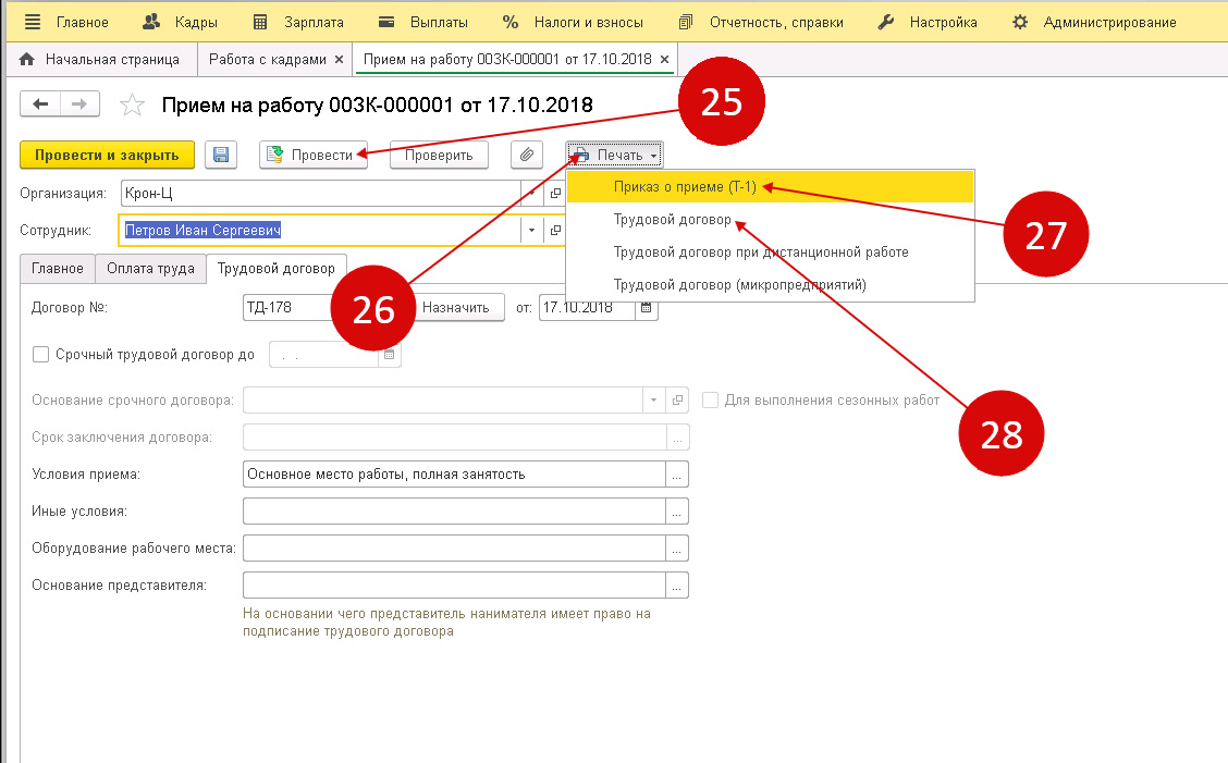 Данные для приема на работу внесены в 1С 8.3 ЗУП, нажмите кнопку «Провести» (25) для завершения операции. Далее вы можете распечатать приказ о приеме на работу и трудовой договор. Для этого нажмите кнопку «Печать» (26) и выберете нужные ссылки, например «Приказ о приеме (Т-1)» (27) или «Трудовой договор» (28).