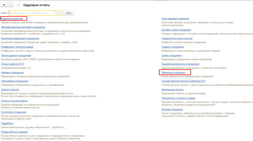 - Выберите «Увольнения» или «История кадровых изменений», в зависимости от версии программы.